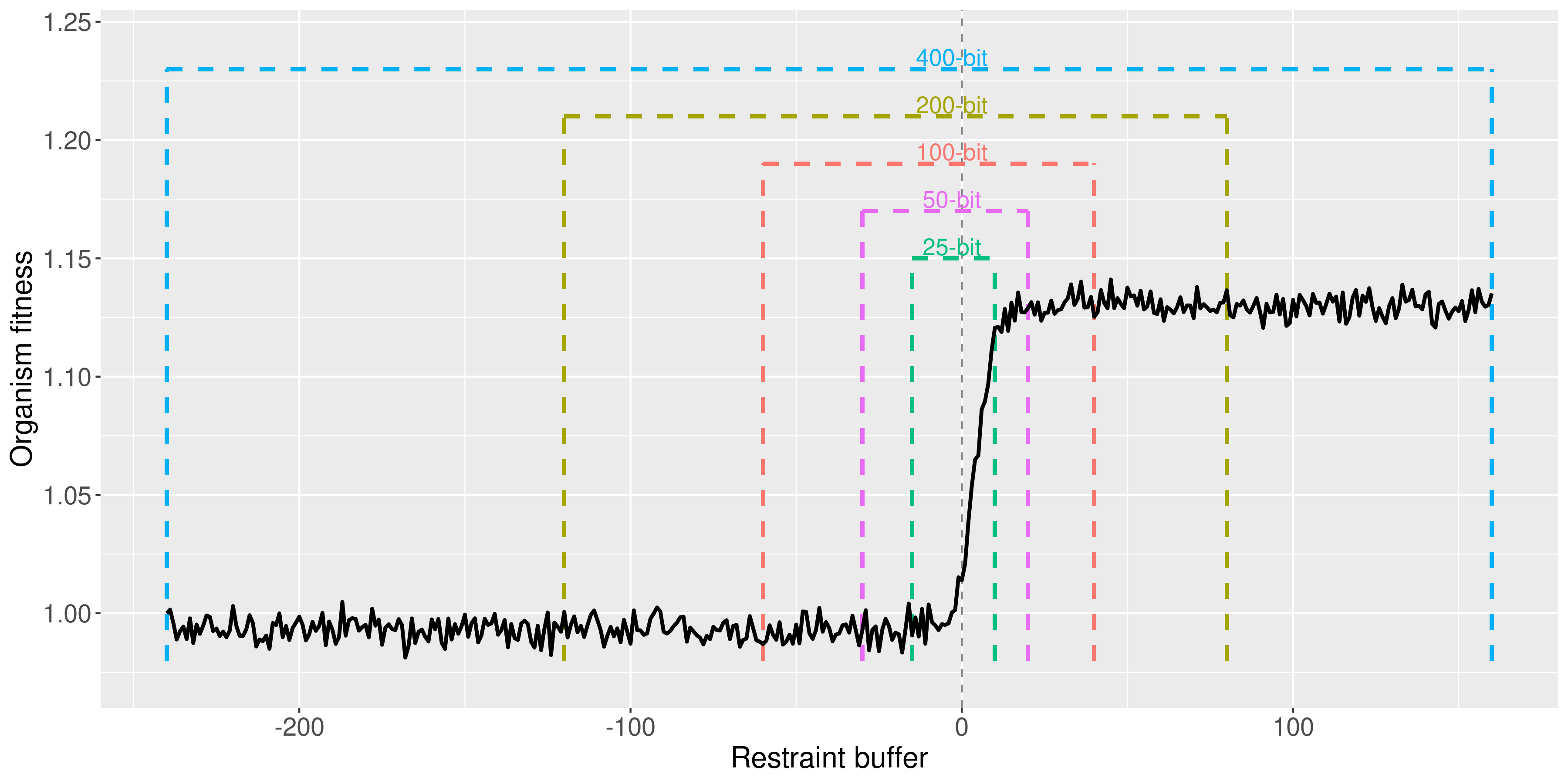 To accomplish this, we generated fitness data for organisms with 400-bit genomes. For smaller genome lengths, we reuse the 400-bit data by lining up restraint buffer values. Thus the difference in genome lengths simply changes the range of restraint buffer values available in the genome. The fitness data for 64x64 organisms is shown below, showing the range of each genome length.
