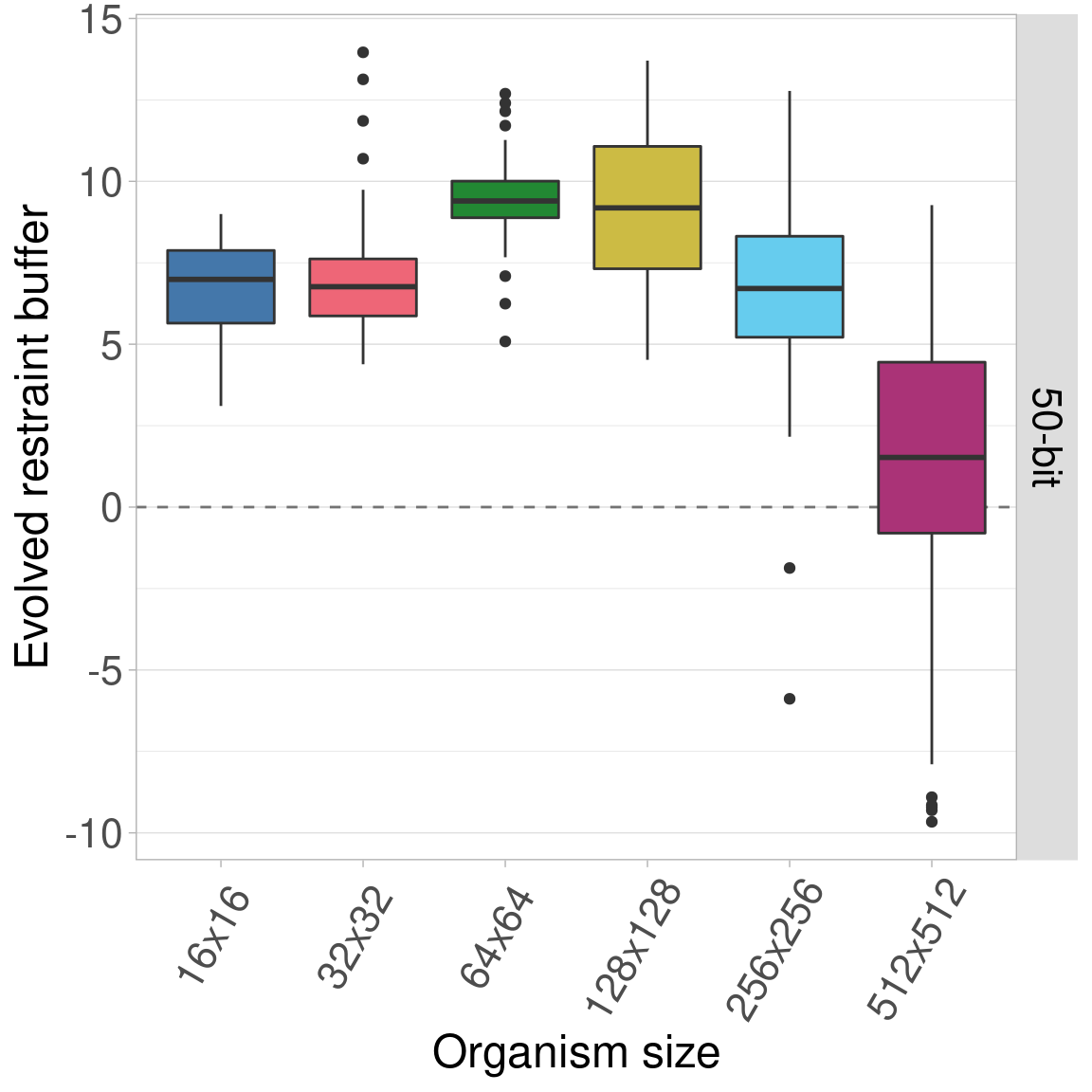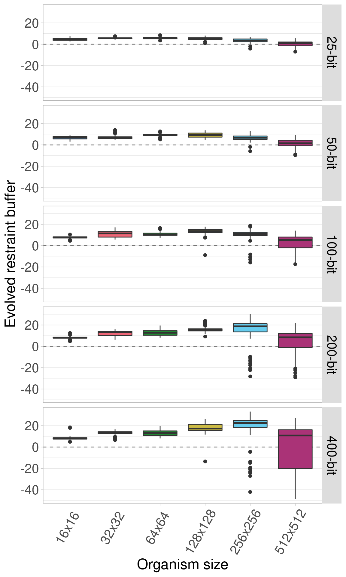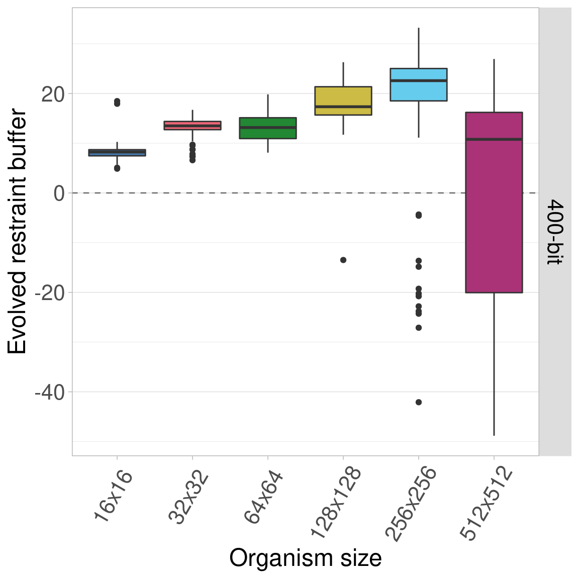 These plots show no qualitative difference with the genome length experiment. Increasing organism size correlates with evolved restraint buffers until a point, and then larger organisms evolve less restraint than their smaller counterparts.