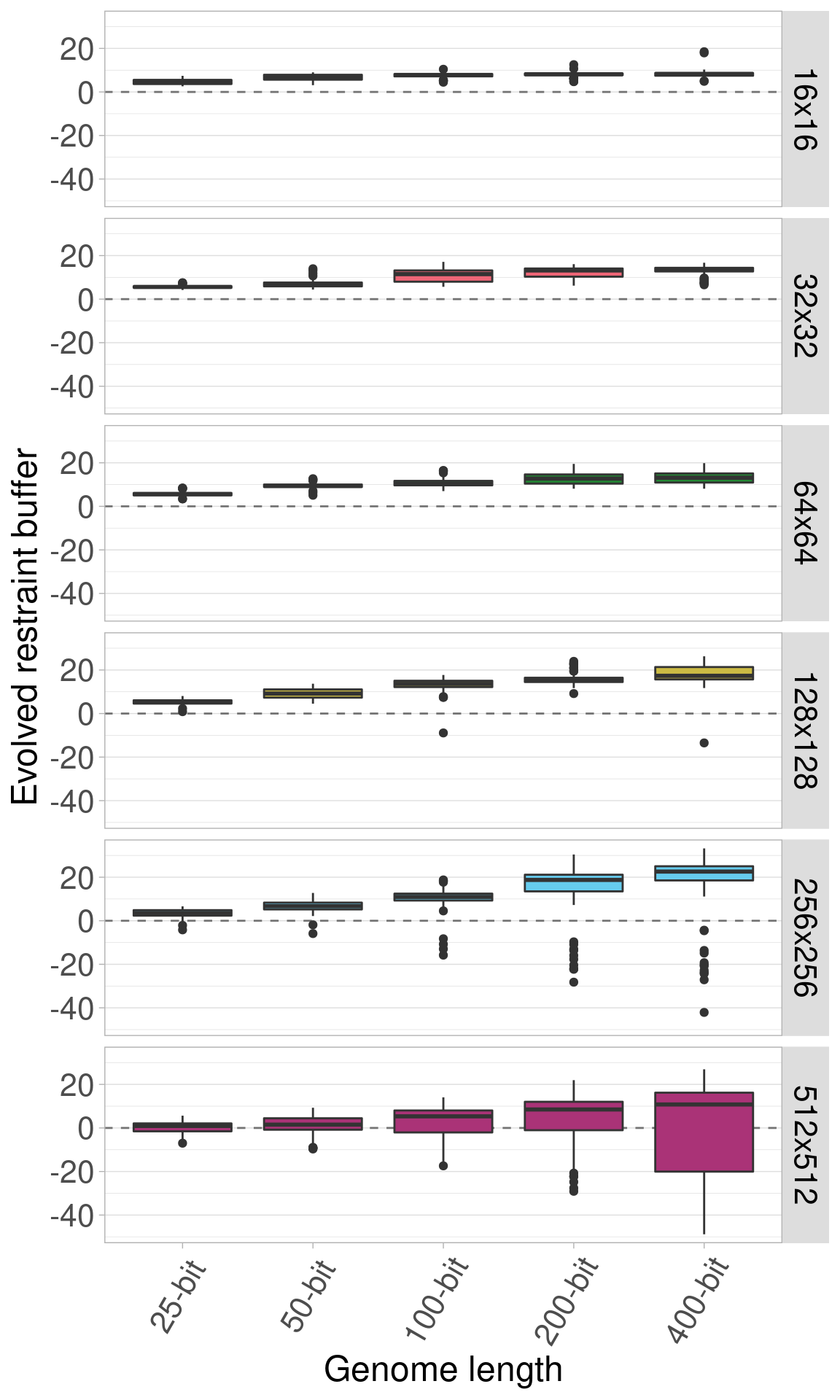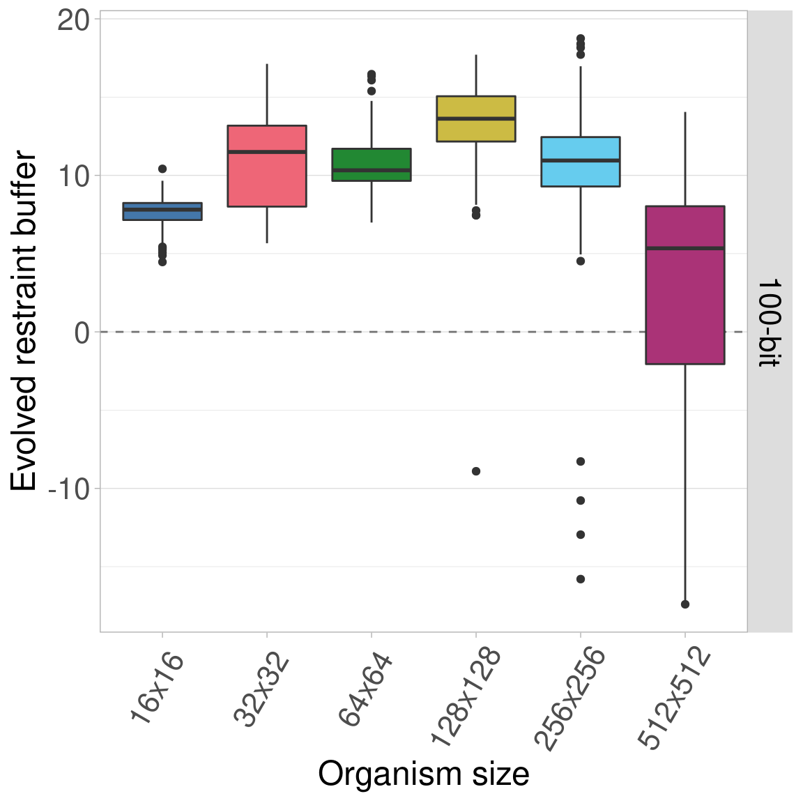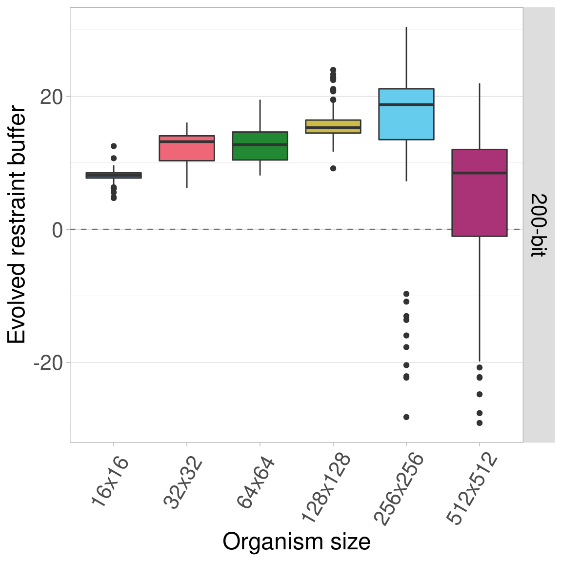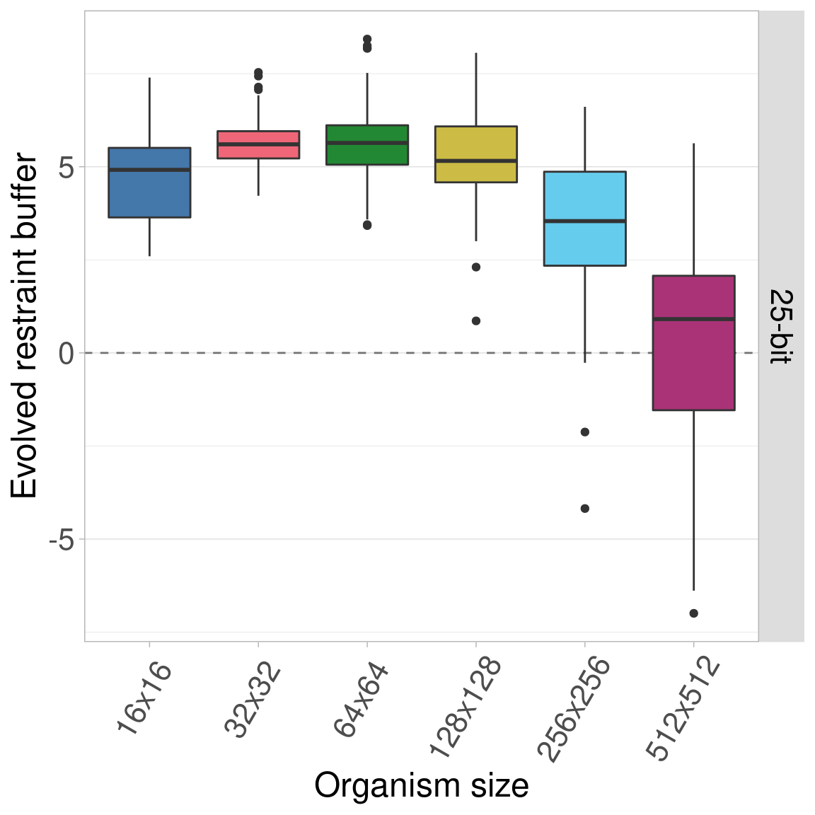 These plots show no qualitative difference with the genome length experiment. Increasing organism size correlates with evolved restraint buffers until a point, and then larger organisms evolve less restraint than their smaller counterparts.
