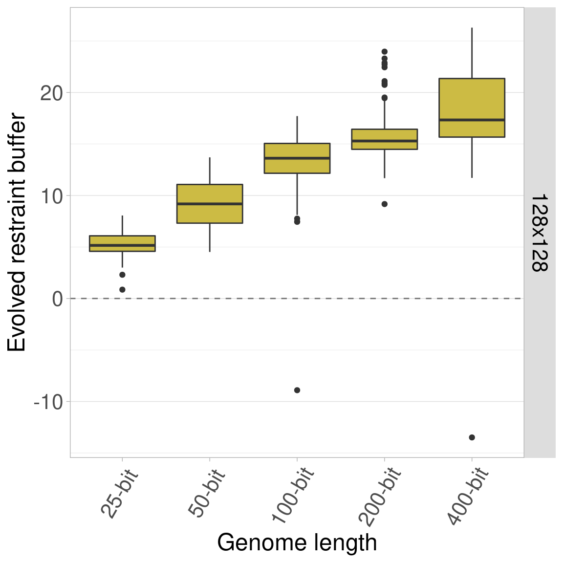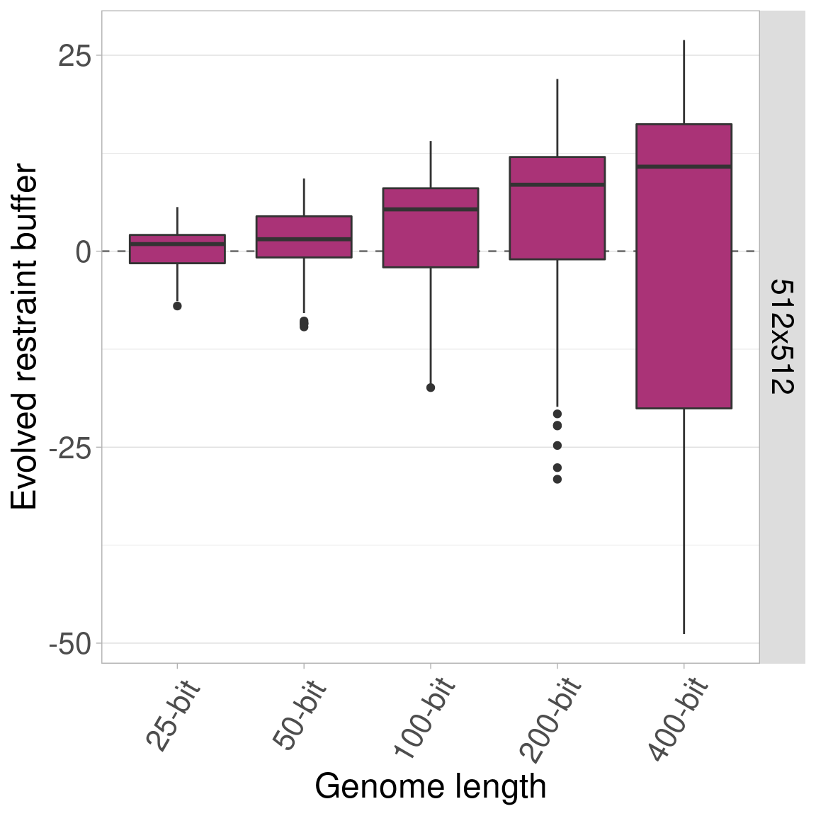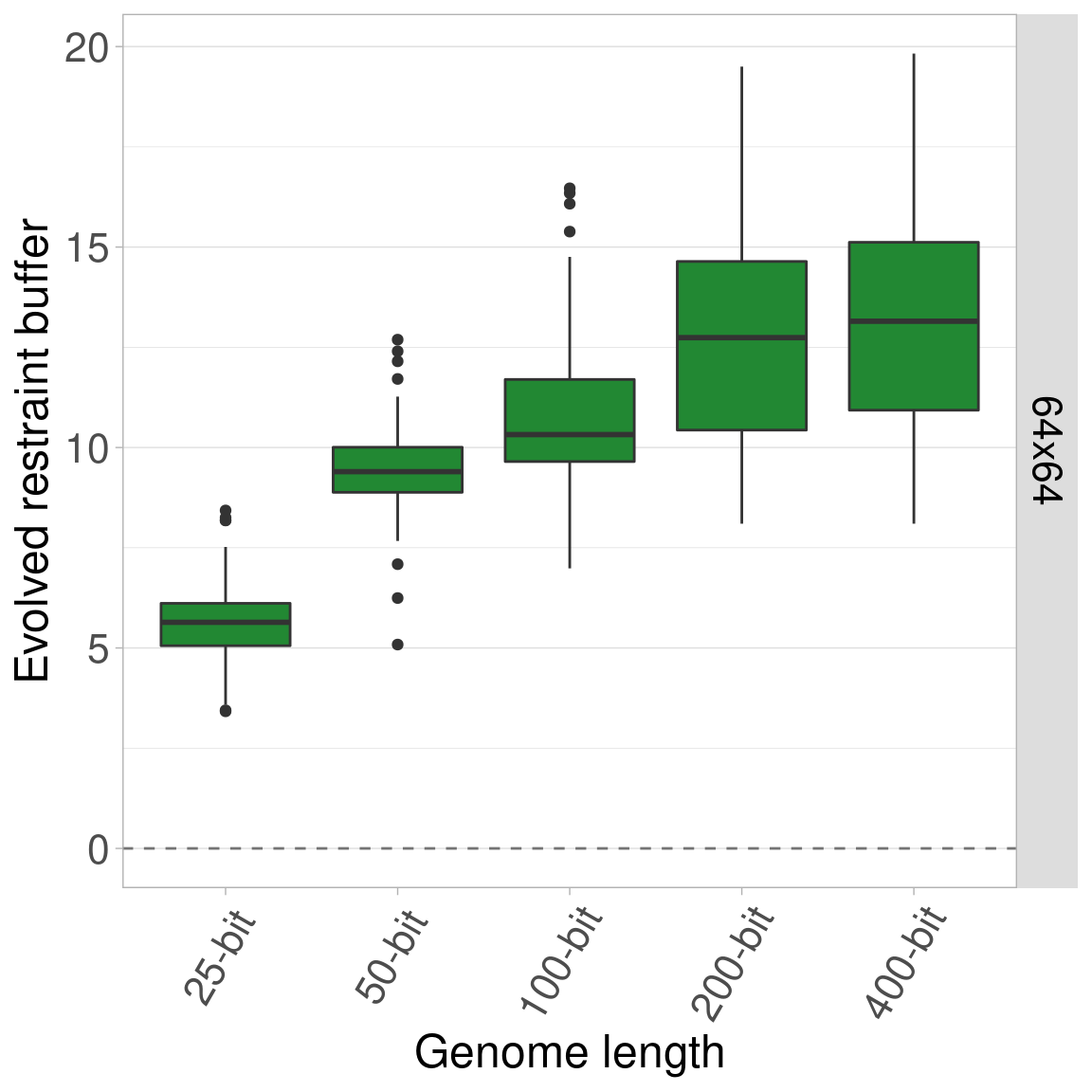 In the genome length experiment, we observed that varying the genome length affects the evolution of organisms in two ways: 1) mutational pressure is reduced at the population level as genome length increases, and 2) longer genomes have a higher organism fitness at the same restraint buffer value. We wanted to test the effect of reduced mutational pressure by itself.