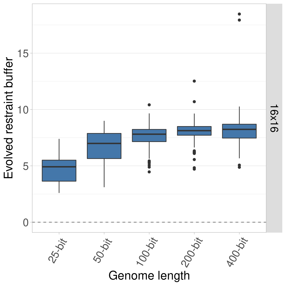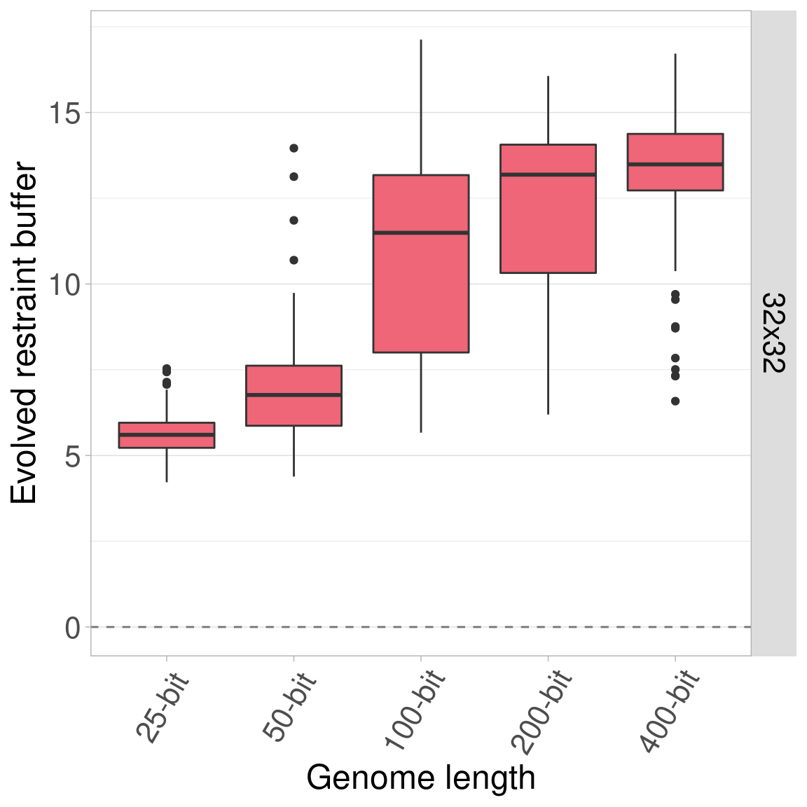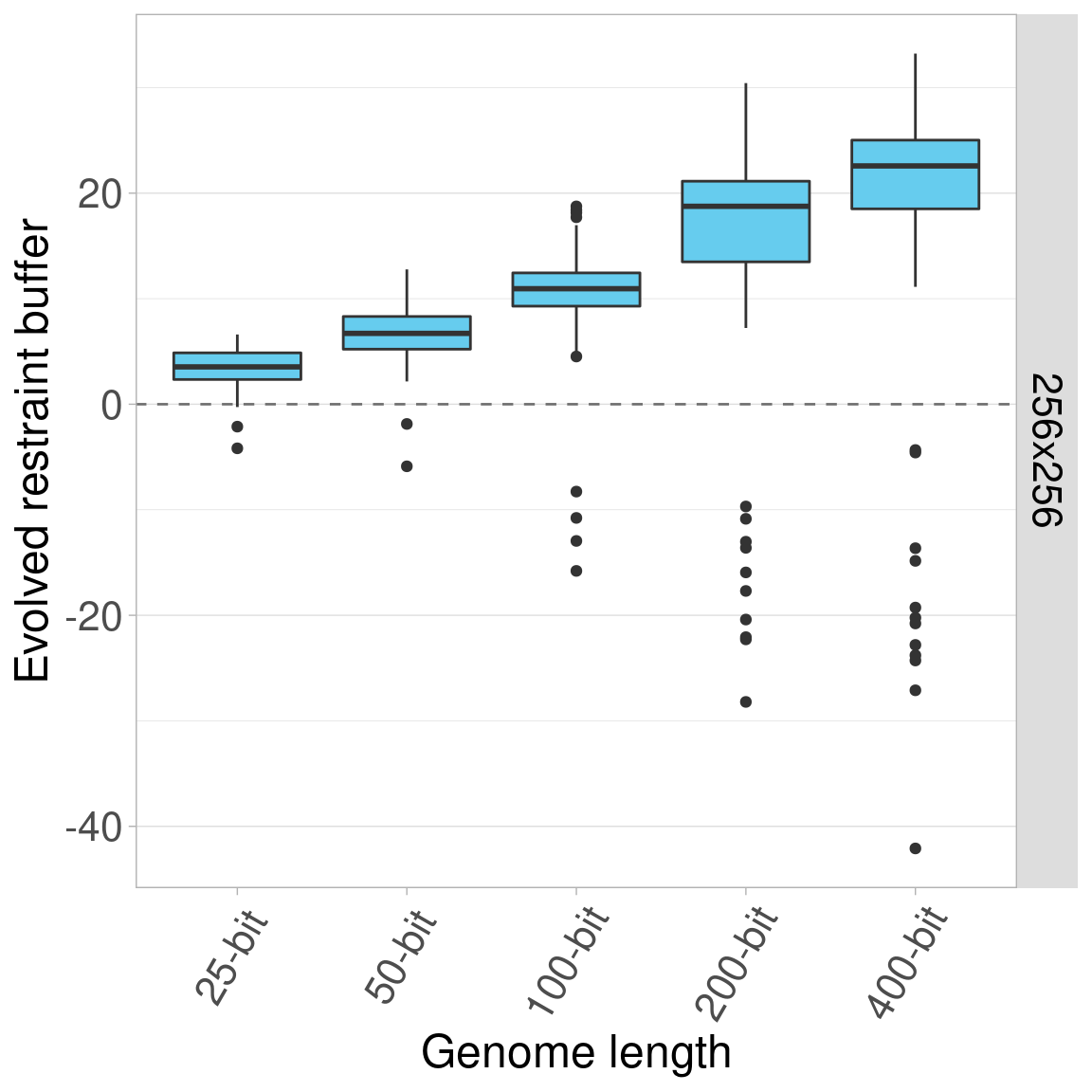 In the genome length experiment, we observed that varying the genome length affects the evolution of organisms in two ways: 1) mutational pressure is reduced at the population level as genome length increases, and 2) longer genomes have a higher organism fitness at the same restraint buffer value. We wanted to test the effect of reduced mutational pressure by itself.