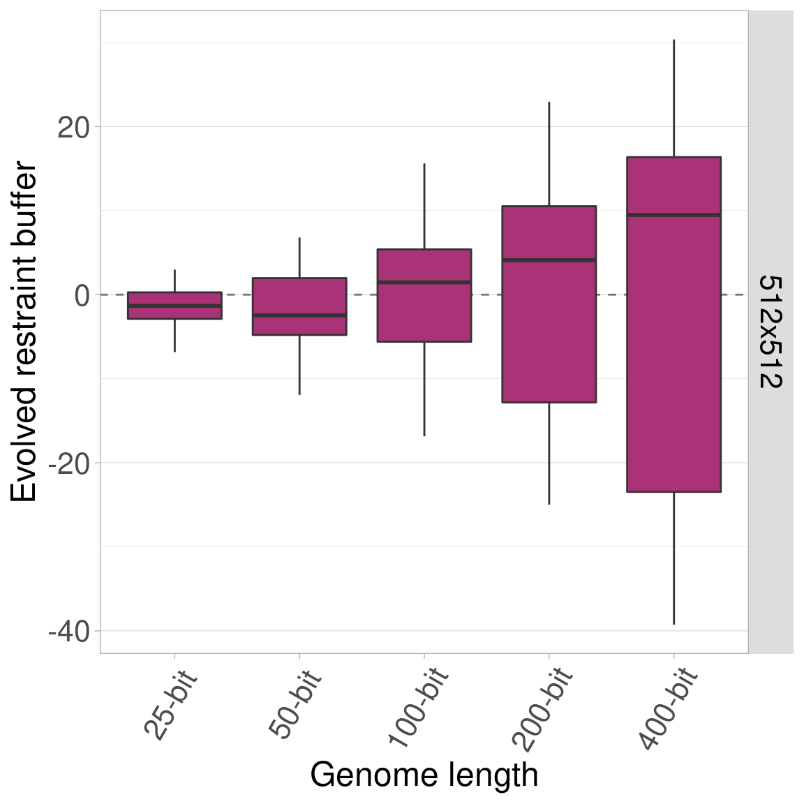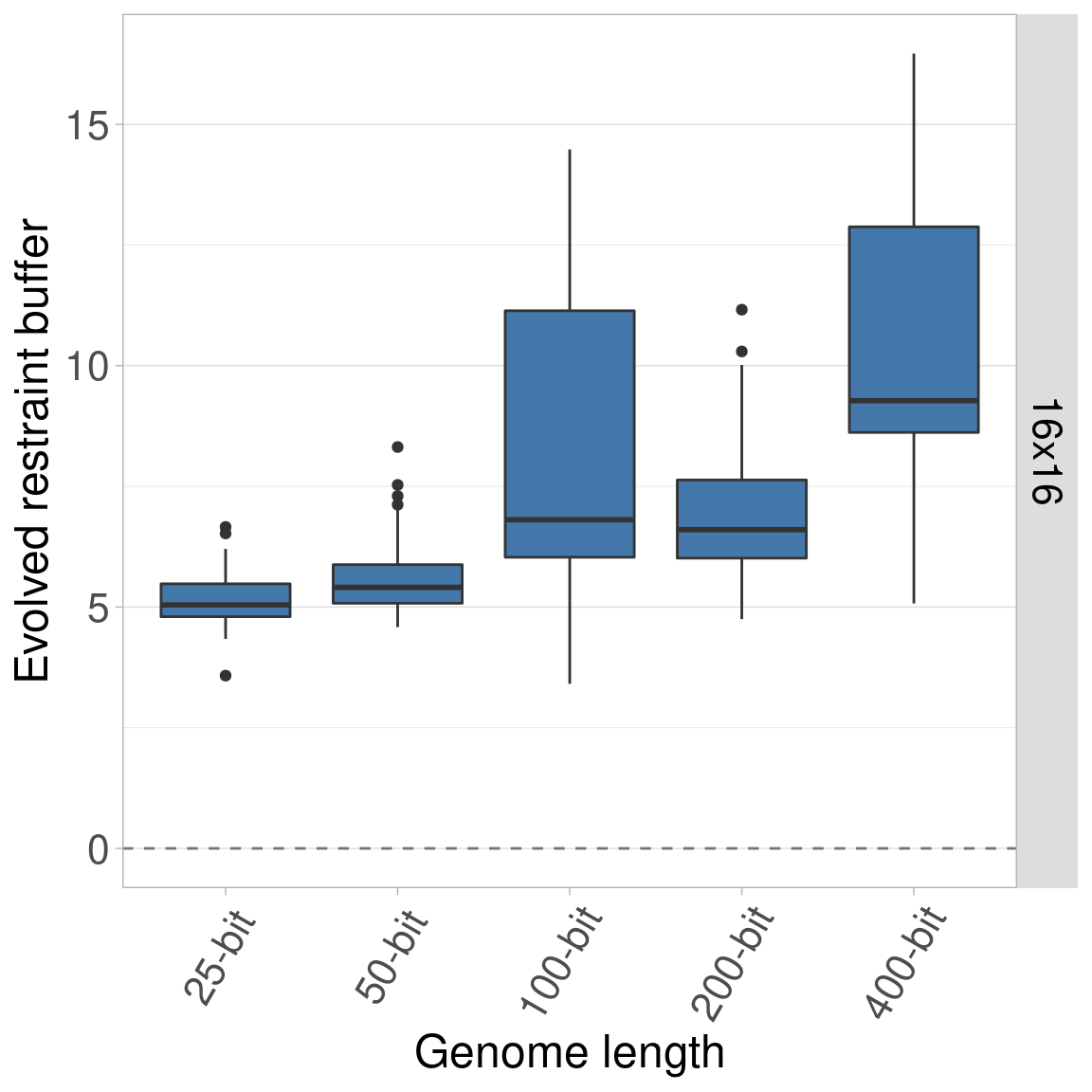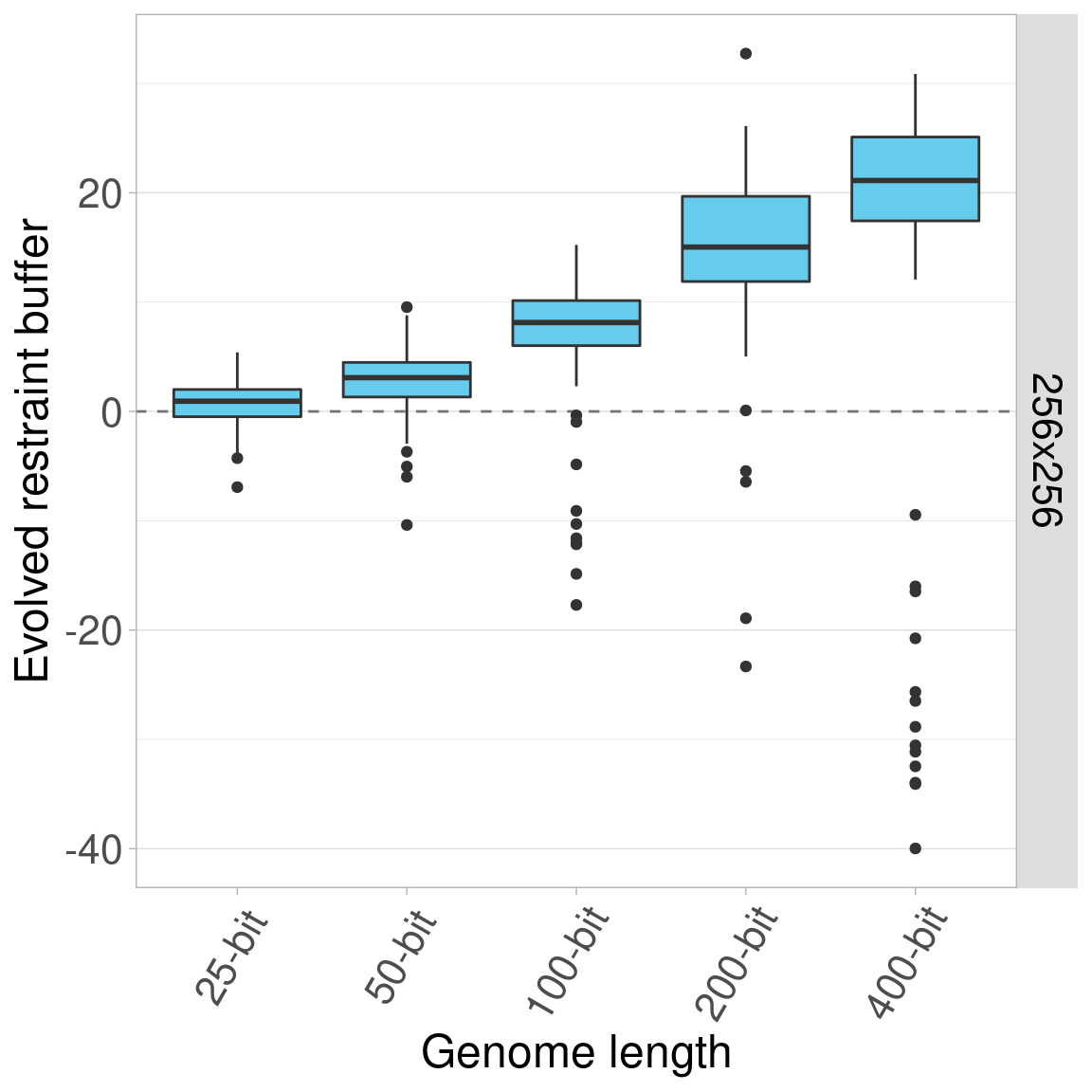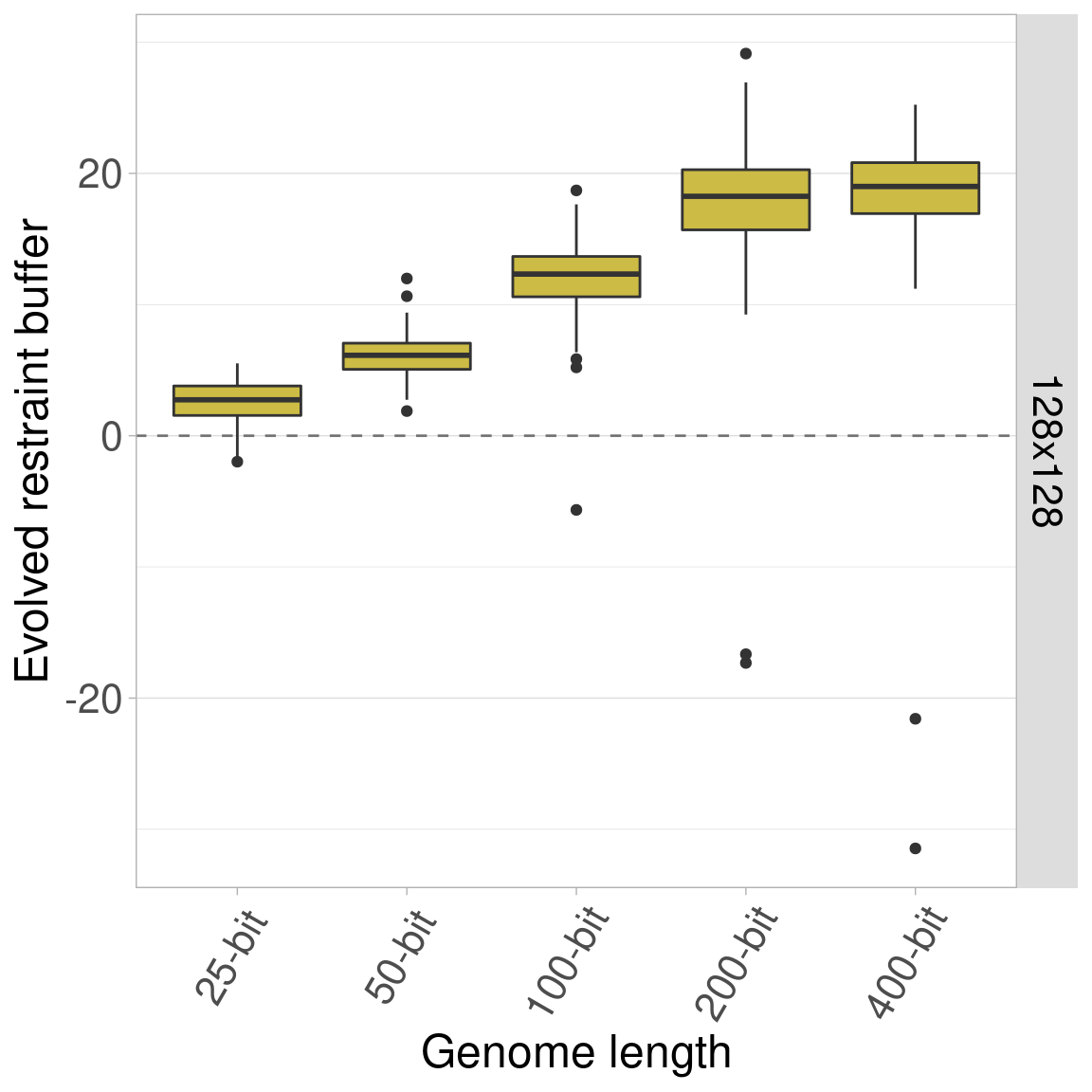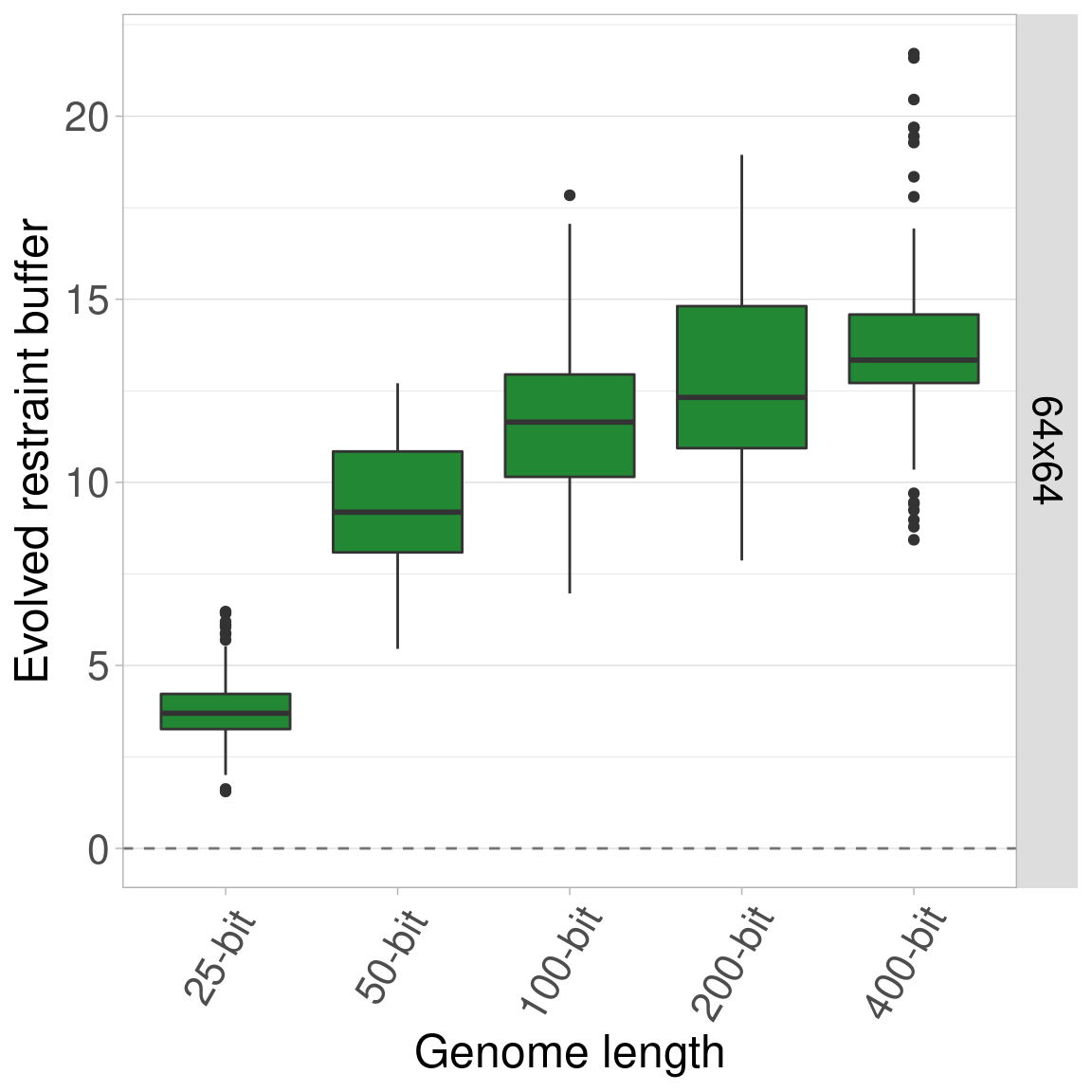 By default, all genomes are bitstrings with 100 bits. Here, we look into the effects of varying this genome length using lengths of 25, 50, 100, 200, and 400 bits. Regardless of genome length, the restraint threshold was set at 60% of the genome being 1s and all organisms started at a restraint buffer of 0.