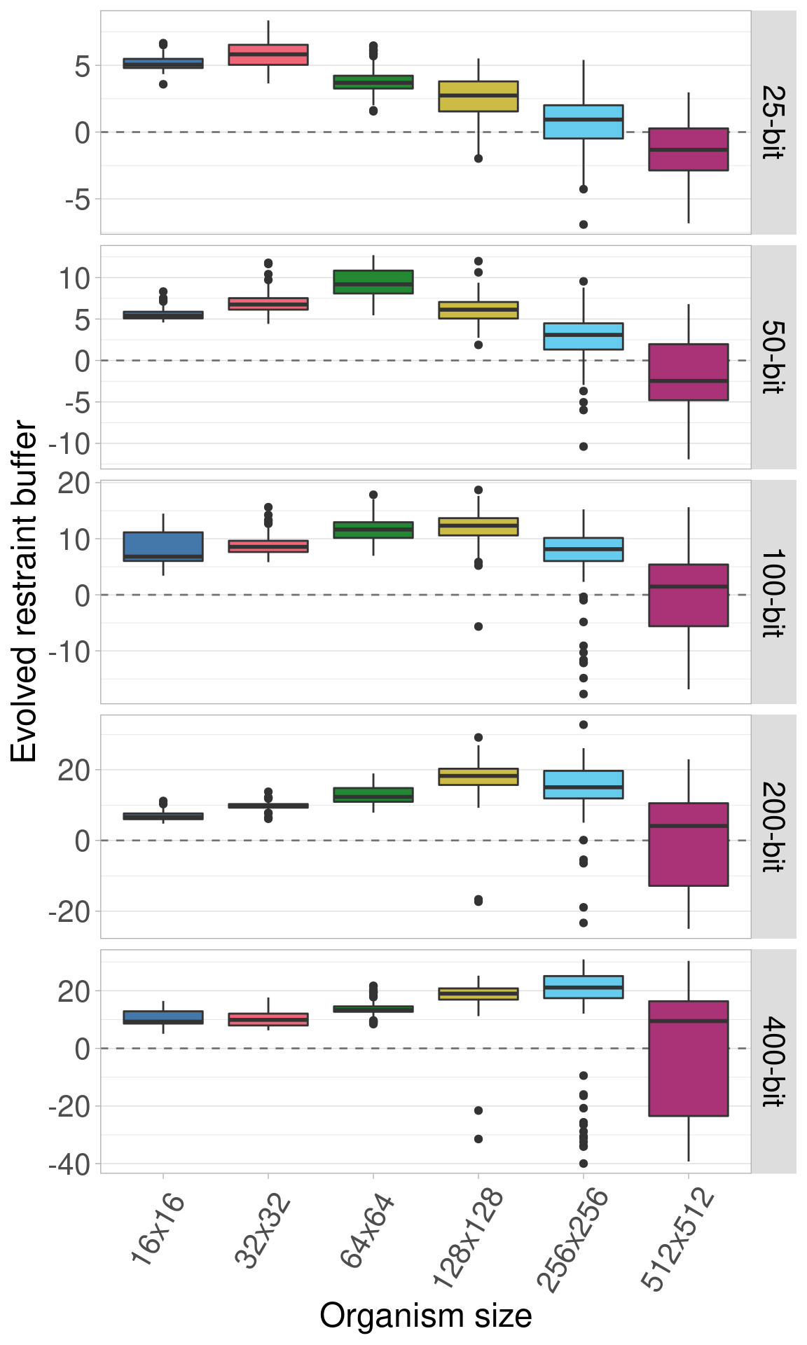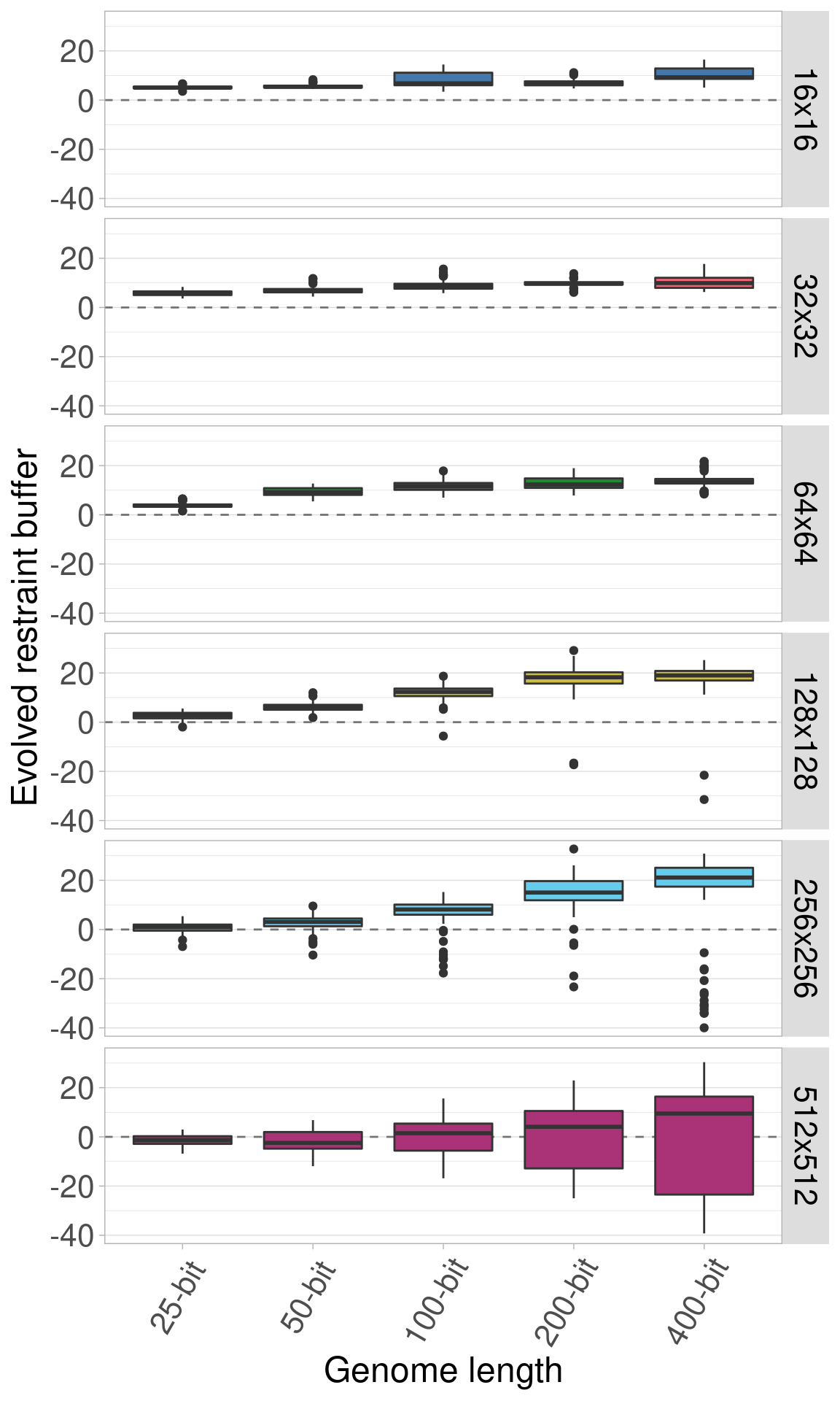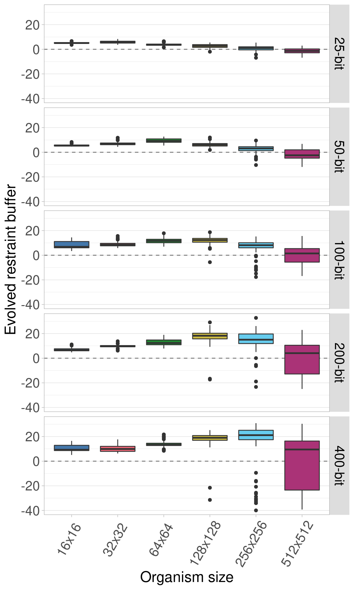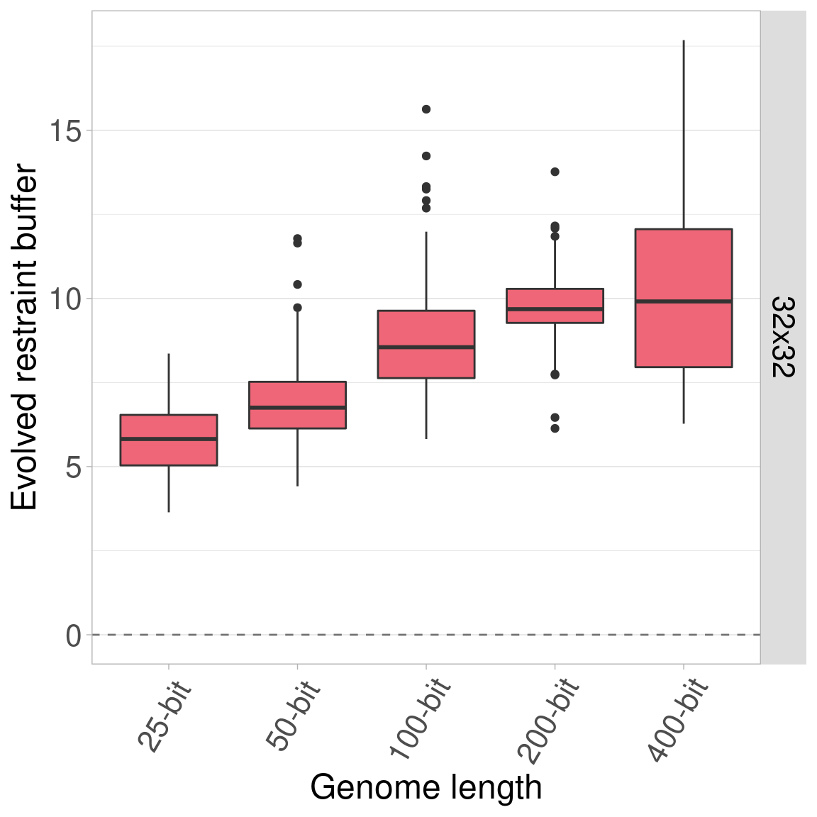 By default, all genomes are bitstrings with 100 bits. Here, we look into the effects of varying this genome length using lengths of 25, 50, 100, 200, and 400 bits. Regardless of genome length, the restraint threshold was set at 60% of the genome being 1s and all organisms started at a restraint buffer of 0.
