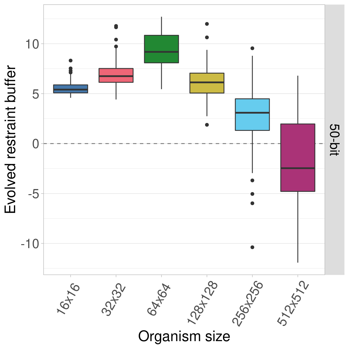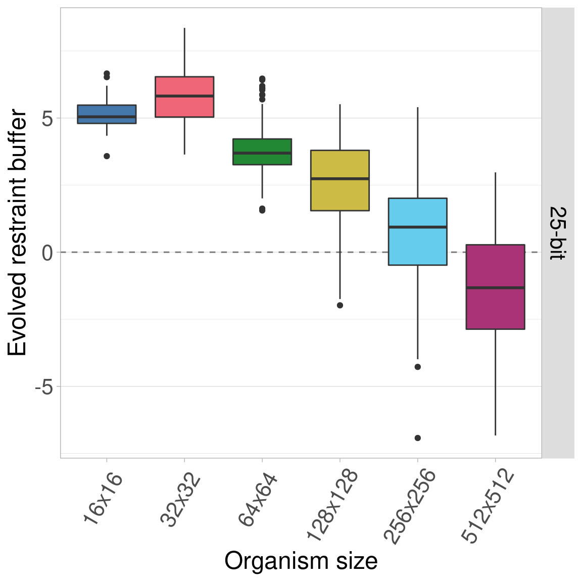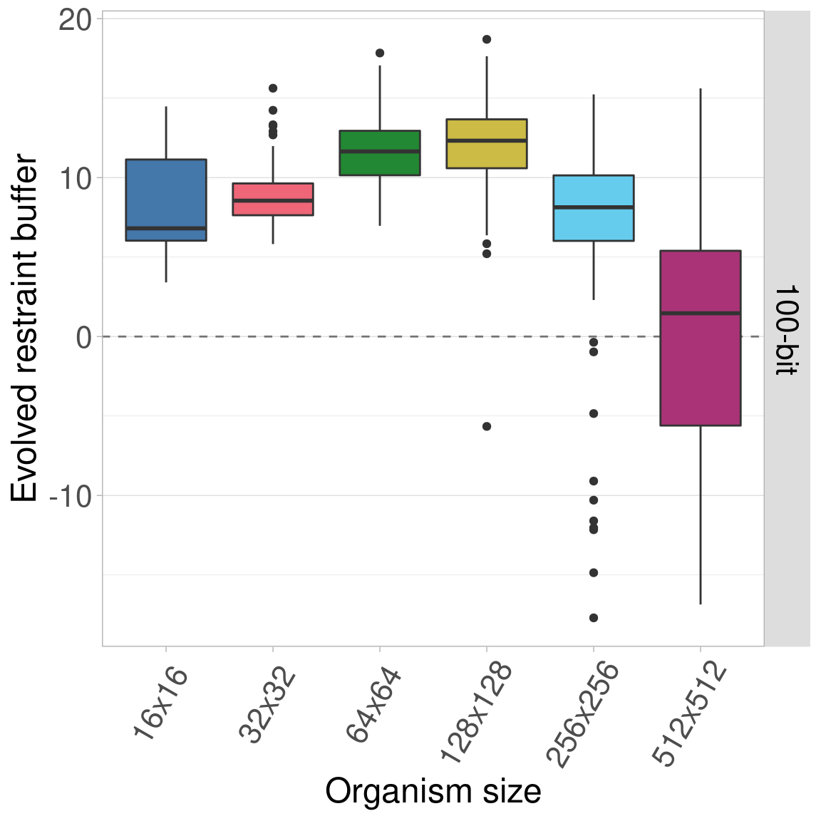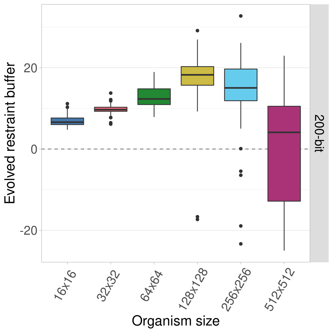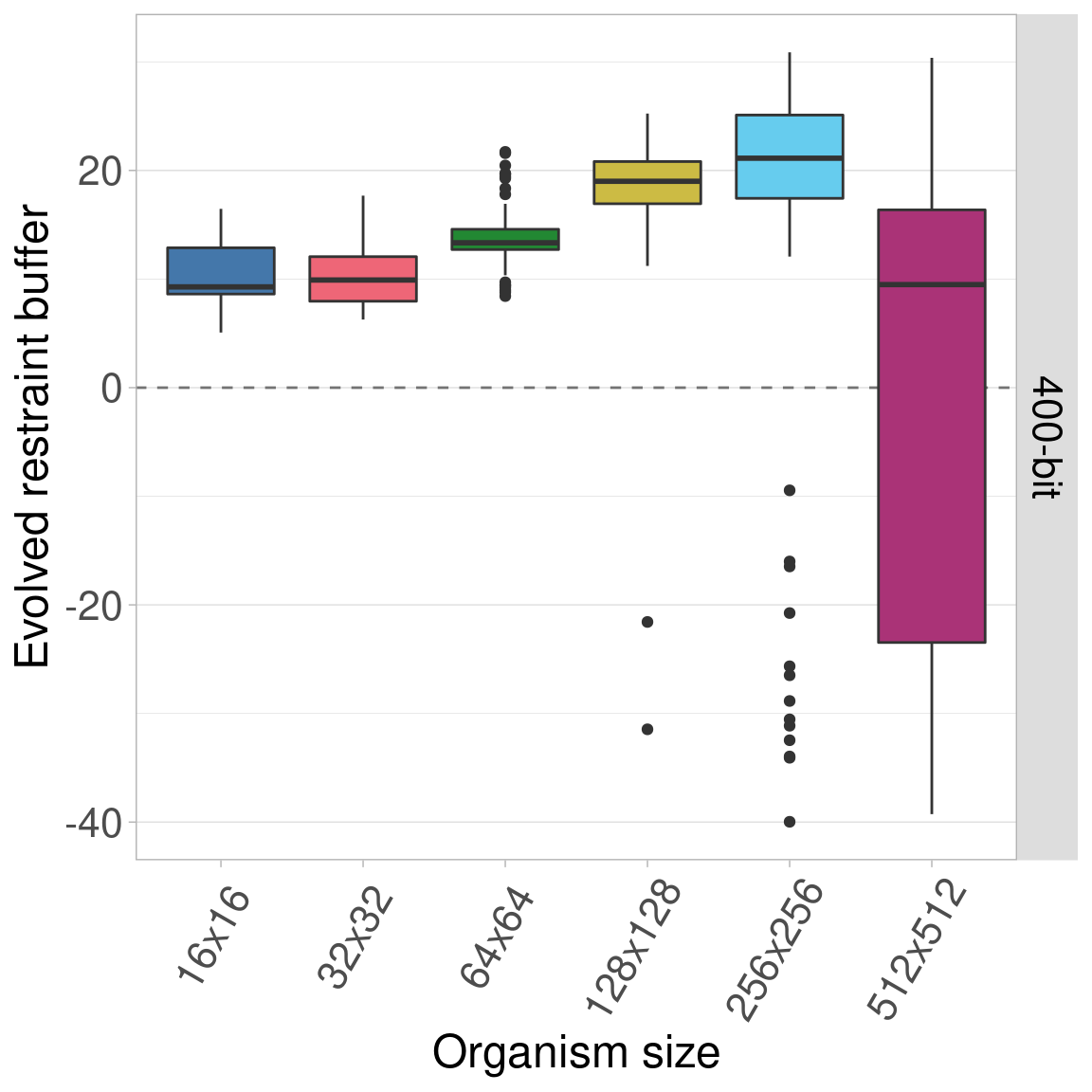 By default, all genomes are bitstrings with 100 bits. Here, we look into the effects of varying this genome length using lengths of 25, 50, 100, 200, and 400 bits. Regardless of genome length, the restraint threshold was set at 60% of the genome being 1s and all organisms started at a restraint buffer of 0.