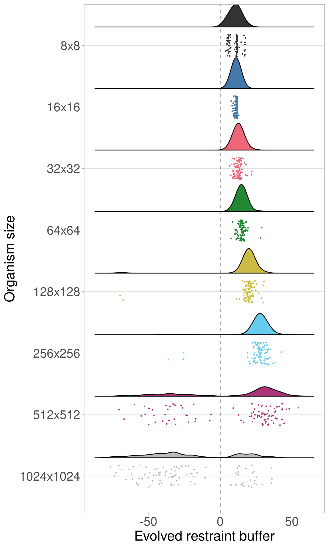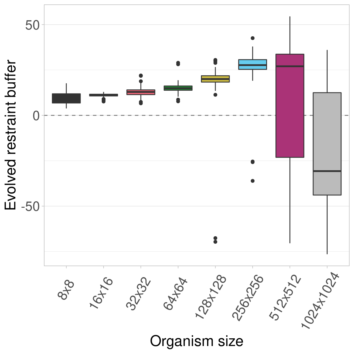 These plots show that the same trend observed in the baseline experiment (that evolved restraint buffers initially increase and then decrease with increasing organism size) still appears when organism genomes are not limited in length.