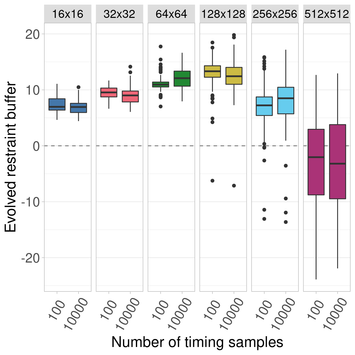 By default, we calculated 100 timing samples for each combination of organism size and restraint buffer value to use for organism fitness in Primordium (a new batch was generated for each experiment). This experiment showed that increasing from 100 samples to 10,000 samples has no qualitative difference on results. This was done by replicating the baseline experiment using 10,000 samples and comparing the results to a fresh run with 100 samples.